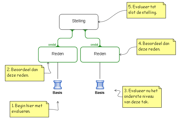 We begrijpen een redenering door bovenaan te beginnen en naar beneden toe te lezen. We evalueren een schema van onderen naar boven, een tak tegelijk, en evalueren als laatste de stelling:
