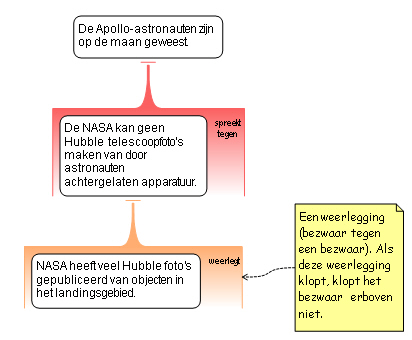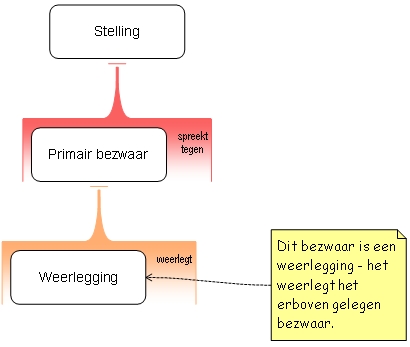 Het schema hierboven bevat geen twee bezwaren tegen de stelling op het bovenste niveau. In plaats daarvan bevat het één bezwaar tegen die stelling alsmede een bezwaar tegen dat bezwaar.