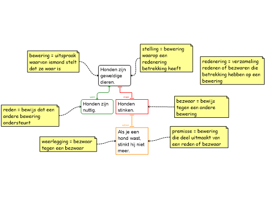 • De leerling kan het onderscheid maken tussen verschillende beweringen, namelijk: stellingen, premissen, redenen, bezwaren en weerleggingen en de verhouding tussen dergelijke beweringen uitleggen.