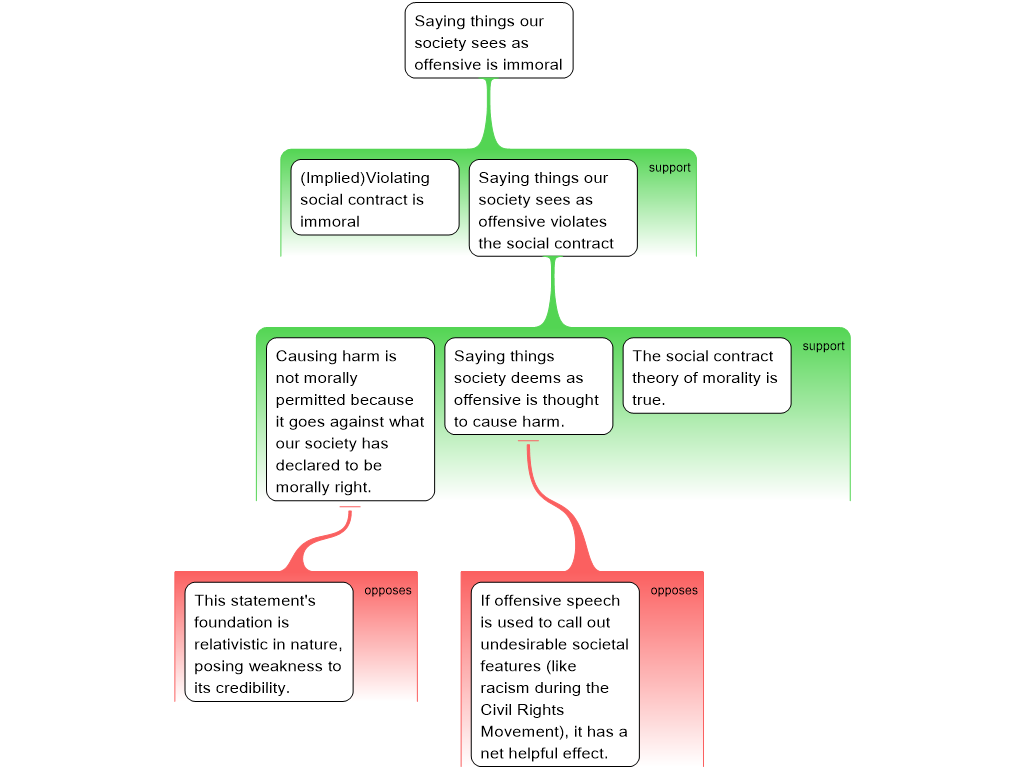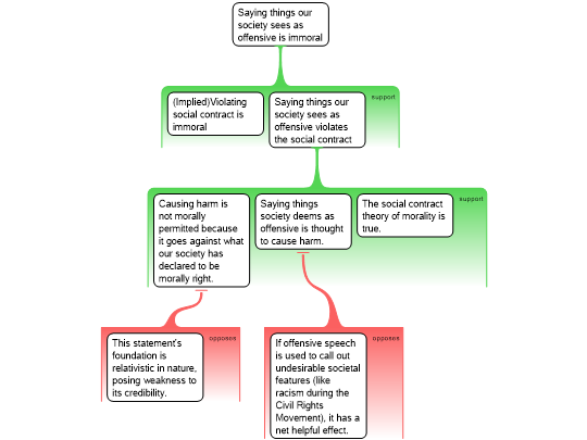 "The social contract theory of morality is true. In our society, it is morally wrong to say anything that society deems to cause offense, since offense is thought to cause harm. Causing harm is not morally permitted because it goes against what our society has declared to be morally right. Therefore, since saying things we see as offensive violates our social contract, it is immoral."